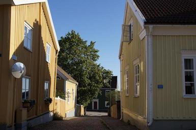 Keywords: vimmerby smaland sweden city road train wooden houses historically building old town city view swedish