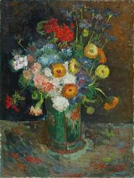 | Keywords: Vincent van Gogh - Zinnias et géraniums dans un vase, 1886 (Musée des beaux-arts du Canada).jpg Artwork Creator Vincent van Gogh Paris summer 1886 oil cardboard canvas cm 61 45 9 Institution National Gallery of Canada accession number 5045 http //www gallery ca/fr/voir/collections/artwork php mkey 2510 Musée des beaux-arts du Canada Ottawa<br/>http //www vangoghgallery com/catalog/Painting/687/Vase 20with 20Zinnias 20and 20Geraniums html vangoghgallery com object history langSwitch Purchased Acheté en 1950 credit line exhibition history Vincent lower right signature Van Gogh catalogues 241 1134 109038~11896 PD-old-100 DEFAULTSORT Van Gogh 1886 Vase with Zinnias and Geraniums National Gallery of Canada Zinnias et géraniums dans un vase |