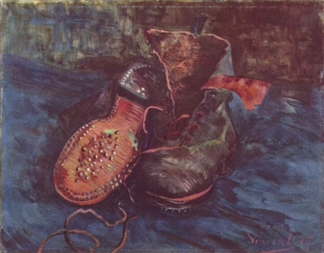 | Keywords: Vincent Willem van Gogh 117.jpg Artwork Creator Vincent van Gogh Paris early 1887 oil canvas cm 34 41 5 Institution Baltimore Museum of Art accession number 1950 302 http //www artbma org/educators/atg/pdf/atg_12-07 pdf The Baltimore Museum of Art<br/>http //www vangoghgallery com/catalog/Painting/379/Pair 20of 20Shoes 20A html vangoghgallery com object history credit line The Cone Collection formed by Dr Claribel Cone and Miss Etta Cone of Baltimore Maryland exhibition history Vincent 87 ~ lower right signature and date Van Gogh catalogues 333 1236 Yorck http //mail wikipedia org/pipermail/wikide-l/2005-April/012195 html PD-old-100 PD-Art-YorckProject DEFAULTSORT Van Gogh 1887 A pair of shoes Baltimore Museum of Art A pair of shoes by Vincent van Gogh Paris 1887 |