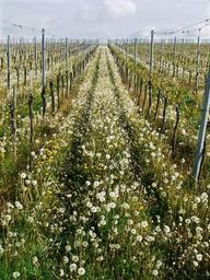 Keywords: vineyard natural series direction upward spring vines dandelions nature top slope may before foliation wildflowers green white parallel retirement phase wine dawn region heilbronn swiss francs stuttgart