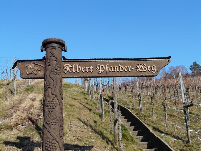 Keywords: vineyard wine winegrowing vine plantation autumn cultivation signposts wood directory migratory character shield hiking wood carving carving