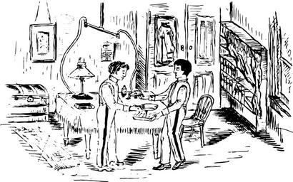Keywords: vintage black and white sketch drawing retro old old fashioned antique people youth men indoors interior college
