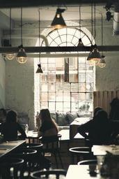 Keywords: vintage restaurant window lamps interior design home decor people talking conversation