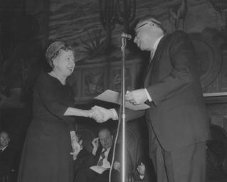 <b>Summary</b>: Assistant Secretary of the Interior Frank P. Briggs (1894-1992) presents a citation for distinctive service to Viola Shelly Shantz (1895-1977). She also received the Gold Medal at the Interior Auditorium on that date. Shantz served as a Biological Aide, Biologist, and Systematic Zoologist with the United States Fish and Wildlife Service and its predecessor, the Bureau of Biological Survey, from 1918 to 1961. During her career she served as Curator of the North American mammal collection of the Bird and Mammal Laboratories housed in the National Museum of Natural History