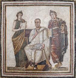 MAKE A MEME View Large Image Virgil mosaic in the Bardo National Museum (Tunis) (12241228546).jpg Der große lateinische Dichter Virgil in den Händen die Schrift Aeneid Links steht die Muse Klio Geschichte und rechts steht die Muse Melpomene Tragödie Das Mosaik das ...