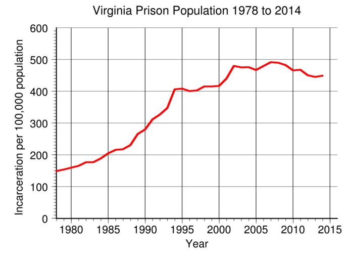 | Keywords: Virginia Prison Population.svg en Virginia prison incarceration rate per 100 000 population from 1978 to 2014 Data from http //www bjs gov/index cfm ty nps BJS 2016-05-11 own Delphi234 other versions current annually Generated with Wikimedia SVG Chart SVG Chart/box cc-zero Prisons in Virginia Imprisonment and detention rates in the United States |