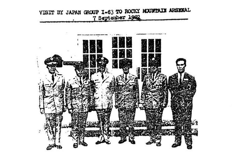 Keywords: Visit by Japan group I-63 to Rocky Mountain Arsenal, 7 September, 1962.jpg en From September 6 to 10 1962 Japan Group I-63 visited Rocky Mountain Arsenal The Japan Group was briefed on arsenal production activities and conducted an orientation tour The I-63 Group consisted of Right to left Mr Taisaku Furuhata JDA-3 Japan Defense Agency; Colonel Hideo Toyama Chemical Chief Chemical Section Ground Staff Office; Major General Fujio Sato Deputy Commandant Fuji Combined Arms School; Colonel Charles McNary Arsenal Commander; Major General Teruto Kunitake DCS Western Army Headquarters; and Major Tomomi Ando Tour Conductor and Interpreter U S Army 2013-04-06 12 46 54 Quarterly Report Rocky Mountain Arsenal Archive July 1 “ September 30 1962 http //rockymountainarsenalarchive files wordpress com/2011/07/ja_112 pdf Retrieved 26 June 2012 U S Army Rock Mountain Arsenal PD-USGov Uploaded with UploadWizard Operation Red Hat Rocky Mountain Arsenal Colorado in the 1960s |