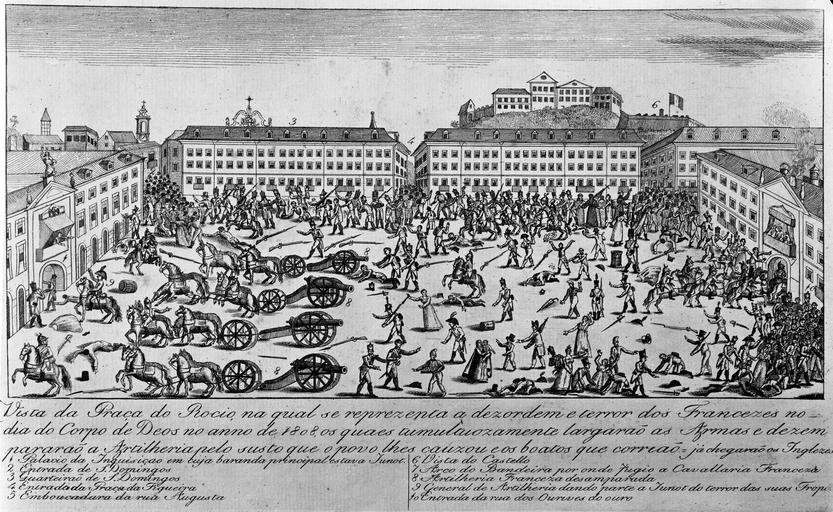 | Keywords: Vista da Praça do Rocio na qual se reprezenta a dezordem e terror dos Francezes no dia do Corpo de Deos no anno de 1808, os quaes tumultuozamente largarão as Armas e dezempararão a Artilheria pelo susto que o povo lhes cauzou.png en View of the Rossio Square in which is depicted the turmoil and terror of the French during the Feast of Corpus Christi on the year 1808 when they tumultuously dropped their Weapons and abandoned their Artillery due to the fight the People caused them and the rumours they heard the English have arrived pt Vista da Praça do Rocio na qual se reprezenta a dezordem e terror dos Francezes no dia do Corpo de Deos no anno de 1808 os quaes tumultuozamente largarão as Armas e dezempararão a Artilheria pelo susto que o povo lhes cauzou e os boatos que corrião já chegarão os Inglezes ~ 1808 http //arquivomunicipal2 cm-lisboa pt/X-arqWeb/SearchResultOnline aspx search _OB 3a 2b_QT 3aMFN_281080_Q 3a_EQ 3aT_D 3aT___ type PCD mode 0 page 0 res 1 simple 1 auth Je 2fvF9H7QyaGXKTczK4ZDHgI5WaOVfJlHb 2f2wDMkYWU 3d Arquivo Municipal de Lisboa author other versions Palácio da Inquisição Corpo de Deus 1808 com Junot na varanda principal png Castelo de São Jorge Corpo de Deus 1808 com a bandeira do Império Francês hasteada png Arco do Bandeira Corpo de Deus 1808 por onde foge a cavalaria Francesa png Custom license marker 2016 10 07 PD-old-100 1808 in Portugal Palácio dos Estaus Praça de D Pedro IV Exterior of Igreja de São Domingos Lisbon Arco do Bandeira Castelo de São Jorge in art Jean-Andoche Junot |
