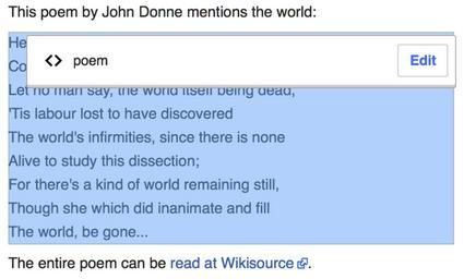 | Keywords: VisualEditor editing poem 1.png en Screenshot of the interface for editing poems in VisualEditor 2015-09-01 Screenshot from mw Help Sample page John Donne text of poem ; own work other text ; VisualEditor authors user interface Wikimedia-screenshot no Cc-zero |