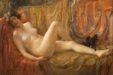 | Keywords: Vitaly Tikhov - Nude With A Dog.jpg Artwork Creator Vitaly Tikhov 1921 Oil on Canvas Size cm 142 5 98 object history exhibition history credit line place of creation В Тихов 1921 lower left signature and date http //www sothebys com/en/auctions/ecatalogue/2008/russian-art-evening-l08116/lot 55 html Sothebys com http //www sothebys com/content/dam/stb/lots/L08/L08116/L08116-55-lr-1 jpg direct link accession number PD-old-auto-1923 1939 Paintings of nude recumbent females supine Nude or partially nude women with animals in art Paintings of women with dogs 1921 oil on canvas paintings Vitaly Tikhov Images from Sotheby's Paintings of nude females with animals |