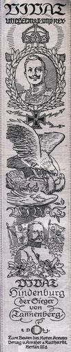 | Keywords: Vivat-bander - 1914 - Hindenburg Tanenburg by E.D.d.j - 2.jpg World War I Vivat ribbon commemorating Battle of Tannenberg Shows Wilhelm II and Hindenburg der sieger von Tannenberg Hindenburg the winner of Tannenberg This battle was led by von Hindenburg was the most significant German victory on the Eastern Front Printed by Amsler Ruthardt in Berlin for German Red Cross to raise funds for war relief The ribbon is lilac in color and measures 15 ½ x 2 ½ self-scanned Color and brightness corrections by user Soerfm 1914 signed E D d j Emil Doepler der Jüngere http //www europeana eu/portal/record/92201/7914C1E222623BE86A419E70E11588F6C91E80FE html Creator Emil Doepler <gallery>Vivat-bander_-_1914_-_Hindenburg_Tanenburg_by_E D d j jpg original colors</gallery> PD-old-auto-1923 1922 World War I Vivat ribbons Battle of Tannenberg 1914 Wilhelm II of Germany in art Paul von Hindenburg 1914 1914 works in Germany German State Crown Scans by Jarek Tuszynski ImageNote 1 100 83 1831 366 1998 9928 2 Vivat ImageNoteEnd 1 ImageNote 2 133 483 1765 233 1998 9928 2 Wilhelm II Imperator Rex ImageNoteEnd 2 ImageNote 3 233 8079 1632 350 1998 9928 2 Hindenburg ImageNoteEnd 3 ImageNote 4 400 8395 1449 650 1998 9928 2 Der Sieger von Tannenberg Victor of Tannenberg ImageNoteEnd 4 |