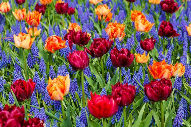 Keywords: orange tulips flower purple bloom grape hyacinths colorful flora fresh garden green holland keukenhof petal flowers spring tulip vibrant