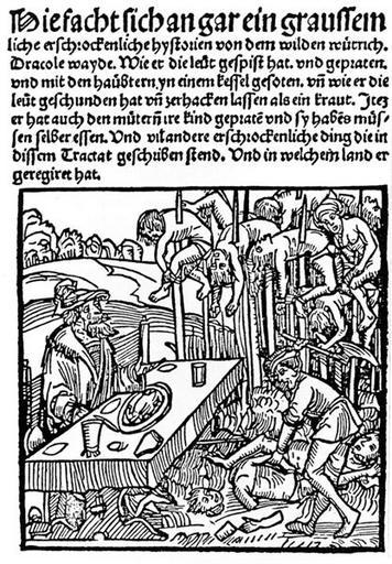Keywords: Vlad Tepes - Blatt 3.jpg Woodcut from the title page of a 1499 pamphlet published by Markus Ayrer in Nuremberg It depicts Vlad III the Impaler identified as Dracole wyade Draculea voivode dining among the impaled corpses of his victims Original caption Hie facht sich an ein graussemliche erschrockenliche hystorien von dem wilden wütrich Dracole wayde Wie er die leut gespist hat und gepraten und mit den haubtern in in einem kessel gesoten und wie er die leut geschunden hat und zerhacken lassen als ein kraut Item er hat auch den mütern ire kind gepraten und sy haben müssen selber essen Und vil andere erschrockenliche ding die in dissem Tractat geschriben stend Und in welchem land er geregiret hat 1499 Markus Ayrer PD-old File Impaled gif PD-old-100 Vlad III the Impaler in engravings Impalement Woodcuts of Germany Massacres in Romania Massacres in art |
