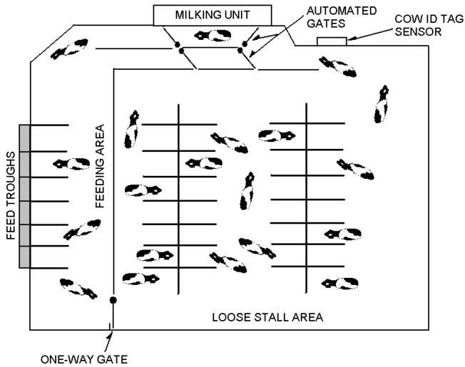 Keywords: VMS Layout.GIF Voluntary milking system “ Typical VMS stall layout forced cow traffic layout for dairy cattle VMS unit at the top before 2006-05-16 Jim White user Jimbo3 Jimbo3 en Automatisches Melksystem svg Dairy farming Automatic milking systems Agricultural diagrams