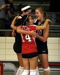Keywords: volleyball team celebration excitement game sport group play fun playing active friends indoors athletes athletic girls female embracing emotion smiling happy cheerful action
