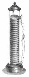 | Keywords: Voltaic pile battery.png Drawing of Alessandro Volta's voltaic pile invented in 1800 the first electric battery It was built of many individual cells each consisting of a disk of copper and a disk of zinc or silver separated by a disk of cloth soaked in acid or brine A 23 cell pile like this would have produced around 36 volts Alterations removed caption Downloaded from http //books google com/books id BgM5AAAAMAAJ pg PA795 Adolphe Ganot 1893 Elementary Treatise on Physics Experimental and Applied 14th Ed William Wood Co New York p 795 fig 764 on Google Books Translated from Ganot's Éléments de Physique by E Atkinson 1893 Adolphe Ganot Public domain - Ganot died in 1887 PD-old Voltaic pile |