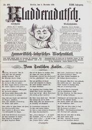 | Keywords: Vom Teutschen Kaiser.jpg Vom Teutschen Kaiser In Kladderadatsch Humoristisch-satirisches Wochenblatt Berlin 23 1870 Seite 493 http //diglit ub uni-heidelberg de/diglit/kla1870/0493 UB Heidelberg 1870 Kladderadatsch Kladderadatsch De Wikisource book leaflet PD-old |