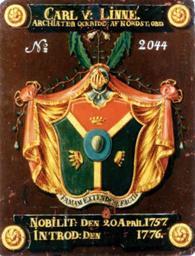 | Keywords: Von Linne Coat of Arms.png Swedish House of Nobility Coat of Arms of Carl von Linné Carolus Linnaeus from his Letter of Nobility The crest is a twinflower one of Linnaeus' favourite plants The shield is divided into thirds red black and green for the three kingdoms of nature animal mineral and vegetable in Linnaean classification; in the center is an egg to denote Nature which is continued and perpetuated in ovo Motto FAMAM EXTENDERE FACTIS to expand fame/reputation by deeds The Swedish House of Nobility Copper plate hung in the Great Hall Author PD-Art DEFAULTSORT Linne von Linné coat of arms Coats of arms of Swedish noble families |