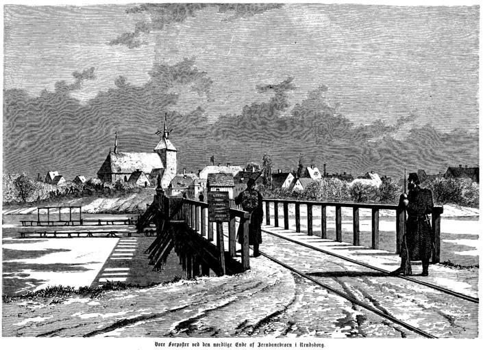 | Keywords: Vore Forposter ved den nordlige Ende af Jernbanebroen i Rendsborg.png  krigen i 1864 Danske tropper bevogter den nordlige side af jernbanebroen over Ejderen og tyske tropper den sydlige Byen i baggrunden er Rendsborg beliggende på en ø midt i Ejderen Bemærk det slesvig-holstenske flag over byen German-Danish War da To hundrede Træsnit Tegninger fra Krigen i Danmark 1864 Forlagsbureauet i Kjøbenhavn G E C Gad Gyldendalske Boghandel C C Lose Delbanco Thieles Bogtrykkeri 1864 Denne illustration optræder på side 21 Egen indscanning en To hundrede Træsnit Tegninger fra Krigen i Danmark 1864 Forlagsbureauet i Kjøbenhavn G E C Gad Gyldendalske Boghandel C C Lose Delbanco Thieles Bogtrykkeri 1864 This illustration appears on page 21 Own scan 1864 da Denne bog er en samling af illustrationer tegnet af i alt 18 forskellige kunstnere Dette billede er skabt af Carl Bøgh 1827-1893 http //www kulturarv dk/kid/VisKunstner do kunstnerId 414 og Carl Neumann 1833-1891 http //www kulturarv dk/kid/VisKunstner do kunstnerId 2465 Første gang aftrykt i Illustreret Tidende nr 227 d 31/1-1864 side 146 http //illustrerettidende dk/iti_pub/cv/main/HaefteSide xsql nnoc iti_pub p_AargangNr 5 p_HaefteNr 227 p_SideNr 146 Ophavsmændene til dette billede døde for mere end 70 år siden og ophavsretten er derfor udløbet en This book is a compilation of illustrations by 18 different artists This image was created by Carl Bøgh 1827-1893 http //www kulturarv dk/kid/VisKunstner do kunstnerId 414 and Carl Neumann 1833-1891 http //www kulturarv dk/kid/VisKunstner do kunstnerId 2465 First printed in Illustreret Tidende No 227 31 January 1864 page 146 http //illustrerettidende dk/iti_pub/cv/main/HaefteSide xsql nnoc iti_pub p_AargangNr 5 p_HaefteNr 227 p_SideNr 146 The authors of this illustration died more than 70 years ago and this image is consequently in the Public Domain PD-old Second Schleswig War Illustreret Tidende To Hundrede Træsnit Tegninger fra Krigen i Danmark 1864 |