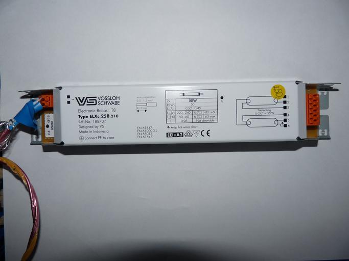 Keywords: Vossloh Scwabe ElBal.JPG en Vossloh Scwabe electronic ballast for 2x58 I took this photo during fixing light in barber shop own Dmitry G Electronic ballasts
