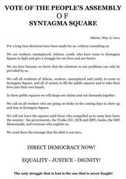 | Keywords: Vote of the People's Assembly of Syntagma Square.svg en The first vote of the People's Assembly of Syntagma Square at the ongoing protests all over Greece The vote summarizes the demands of the demonstrations across the country own based on the official text http //real-democracy gr/el/ CF 88 CE AE CF 86 CE B9 CF 83 CE BC CE B1- CE BB CE B1 CF 8A CE BA CE AE CF 82- CF 83 CF 85 CE BD CE AD CE BB CE B5 CF 85 CF 83 CE B7 CF 82- CF 80 CE BB CE B1 CF 84 CE B5 CE AF CE B1 CF 82- CF 83 CF 85 CE BD CF 84 CE AC CE B3 CE BC CE B1 CF 84 CE BF CF 82-0 here Philly boy92 2011-05 PD-ineligible Cc-zero Indignados Athens |