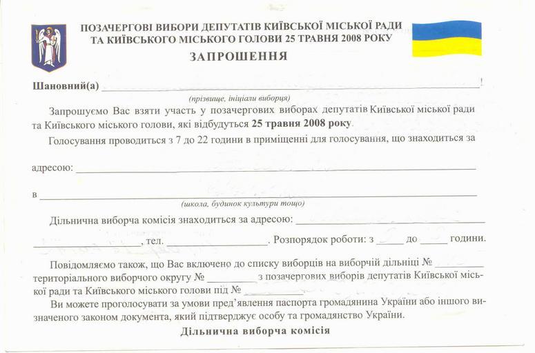 | Keywords: Voter invitation Kiev 2008 Municipal.jpg en Ukrainian voter invitation card Kyiv municipal elections May 25 2008 Obverse ru П иглашение Ук аины на выбо ы депутатов Киевского о одского совета 25 05 2008 Лицевая сто она Own Л П Джепко 2008-08-19 PD-textlogo PD-UA-exempt Voter invitation cards 2008 elections in Ukraine Local elections in Kiev |