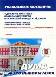 | Keywords: Voter invitation Moscow 2005 1-2.jpg Russian voter invitation card Moscow City Duma elections December 4 2005 Obverse П иглашение РФ на выбо ы депутатов осковской го одской думы 04 12 2005 Лицевая сто она own collection 2005 Moscow City Electoral Commission PD-RU-exempt 4 December Voter invitation cards Elections in Russia 2005 |