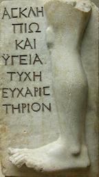 | Keywords: Votive relief Asklepios BM809.jpg Votive relief for the cure of a bad leg inscription Found in 1828 in the same sanctuary in Milos Ægean Sea as the head BM Sculpture 550 Relief votif offert pour la guérison d'une jambe malade Découvert en 1828 dans le même sanctuaire de l'île de Milo en mer Égée que la tête BM Sculpture 550 ca 100 200 AD marble in 31 8 Museum British Museum Upper floor Room 69 Greece and Rome Daily Life case 3 ΑϹΚΛΗΠΙΩ ΚΑΙ ΥΓΕΙΑ ΤΥΧΗ ΕΥΧΑΡΙϹΤΗΡΙΟΠgrc Tyche dedicated this to Asclepios and Hygieia as a thanking gift Tyché a dédié ceci à Asclépios et Hygie en action de grâce object history Milos Cyclades credit line Blacas Collection; ProvenanceEvent purchase 1867 accession number GR 1867 5-8 117 Cat Sculpture 809 own Marie-Lan Nguyen photo date 2006-11-22 other versions Asclepius Hygieia Medicine in ancient Greece Ancient Greek sculptures in the British Museum Ancient Greek inscriptions in the United Kingdom London Ancient Greek dedications and ex-votos Human legs in art Room 69 British Museum Blacas Collection Leg anatomy |