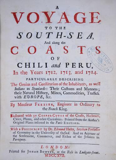 | Keywords: Voyage de Frezier01.jpg fr Relation du voyage de la mer du Sud aux côtes du Chili du Pérou et de Brésil fait pendant les années 1712 1713 1714 Ouvrage enrichi de quantité de planches en taille-douce 1717 traduction anglaise publiée la même année exemplaire de la bibliothèque patrimoniale de Gray France own Jeffdelonge Frézier's travel PD-Art |