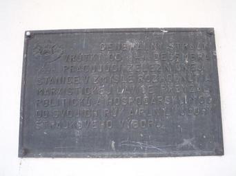 Keywords: Vrutky memorial plaque 1920 strike.JPG Vrútky Slovakia commemorating a Communist-led strike of 1920 2014-08-24 11 31 38 own Jan Pešula cc-zero Uploaded with UploadWizard Monuments and memorials in Vrútky