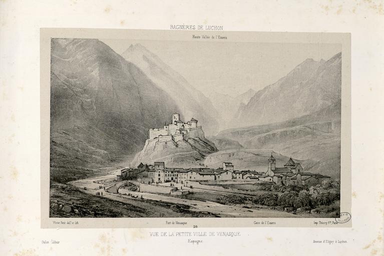 Keywords: Vue de la petite ville de Vénasque - Espagne - Fonds Ancely - B315556101 A PETIT 1 028.jpg Fait partie d'un recueil de 30 lithographies chiffrées de 1 à 30 La lithographie n°16 est sur double page il n'y a pas de lithographie chiffrée 17 Les planches du premier tirage de cette suite imprimées chez Thierry à Paris ont été publiées en 1854 et 1855 L'éditeur de Victor Petit n'est plus celui des précédents recueils Bassy à Pau mais Dulon libraire-éditeur à Bagnères-de-Luchon et à Saintes Dulon publiera ultérieurement à plusieurs reprises des recueils de vues de Luchon et autres sites des Pyrénées par Victor Petit dont la composition est très variable Les planches ne seront plus tirées chez Thierry mais par l'imprimerie J Monrocq à Paris Pièce jointe entre la pl 6 et la pl 7 une pl extraite de Les Pyrénées a été ajoutée Sa légende est la suivante Cirque de Gavarnie - Vue prise du Chemin de la Coumélie Cette planche a été éditée par Dulon mais a été imprimée chez J Monrocq à Paris Ancely René 1876 - 1966 Possesseur fre public domain domaine public B315556101_A_PETIT_1_028 jpg image/jpeg 1 f de pl lithogr ; 26 5 cm oblong Dulon Éditeur Thierry 17 -18 ; imprimeur-lithographe Imprimeur http //numerique bibliotheque toulouse fr/collect/general/index/assoc//ark /74899/B315556101_A_PETIT_1_028 dir/B315556101_A_PETIT_1_028 jpg Bibliothèque municipale de Toulouse A-PETIT 1-27 Creator Victor Jean-Baptiste Petit http //catalogues toulouse fr/web2/tramp2 exe/do_keyword_search/log_in setting_key BMT1 servers 1home query p001940 vignette http //numerique bibliotheque toulouse fr/collect/general/index/assoc//ark /74899/B315556101_A_PETIT_1_028 dir/B315556101_A_PETIT_1_028_thumb jpeg century 19 Vue de la petite ville de Vénasque - Espagne B315556101_A_PETIT_1_028 lithography - print Women in art Castles in art Ramparts Victor Jean-Baptiste Petit Castles in the province of Huesca History of Pyrénées Benasque Bridges in art Towers in art Churches in art Mounds Bell towers in art Mountains in art Roads in art Men in art Houses in art Rivers in art Esera River |