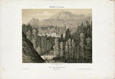 | Keywords: Vue de St. Sauveur (Hautes-Pyrénées) - Fonds Ancely - B315556101 A MERCEREAU 7 097.jpg Impression en 3 coul par Frick frères à Paris Fait partie d'un ensemble de recueils de lithographies de Mercereau composés de lithographies provenant de La France de nos jours vaste suite publiée par livraisons de 1853 à 1876 et comprenant 475 planches en deux tirages l'un à deux teintes noir et bistre l'autre en couleurs Les libraires ont réuni ces planches en albums de composition variable quant au nombre de planches et aux dessinateurs Asselineau Mercereau Maurice Deroy etc Un titre Les Pyrénées par Ch Mercereau; Bagnères-de-Luchon par Ch Mercereau était frappé sur le plat supérieur de la reliure de l'album ainsi que le nom du Libraire pour lequel il était réalisé La plupart des recueils de ces planches pyrénéennes portent le nom de Sajous libraire à Bagnères-de-Luchon Pl 1 à 18 numérotées de 370 à 386 Pl 374 pl 5 et 6 en double -- Pl 19 20 et 21 numérotées respectivement 407 415 et 418 Ces trois pl ont été dessinées et lithographiées par Asselineau -- Pl 22 23 et 24 numérotées 438 439 et 440 -- Pl 22 lith par Aubrun -- Pl 25 numérotée 441 -- Pl 26 à 40 numérotées de 327 à 341 -- Pl 41 à 46 numérotées de 363 à 368 -- Pl 47 numérotée 369 -- Pl 48 num 292 -- Pl 49 et 50 num 264 et 265 -- Pl 51 et 52 num 268 et 269 -- Pl 53 à 55 num de 293 à 295 -- Pl 56 num 300 -- Pl 57 à 59 num de 307 à 309 -- Pl 60 à 70 num de 316 à 326 -- Pl 71 num 63 dessin et lith d'Asselineau imprimerie Destouches -- Pl 72 et 73 num 87 et 88 dessin et lith d'Asselineau imprimerie Destouches -- Pl 74 num 124 signée Lebreton éditée chez Lalonde à Paris et imprimée chez Becquet frères à Paris -- Pl 75 num 161 dessin et litho d'Asselineau imprimerie Destouches --Pl 76 à 78 num de 207 à 209 -- Pl 79 à 81 num de 211 à 213 -- Pl 82 num 220 dessin et lith de Maurice imprimerie Destouches -- Pl 83 à 86 num de 226 à 229 -- Pl 87 et 88 num 234 et 235 -- Pl 89 à 91 num de 273 à 275 -- Pl 92 et 93 num 290 et 291 Pièces jointes 6 pl sépia dont certaines sont des doubles du recueil de Mercereau Les cinq premières planches sont numérotées respectivement 318 321 324 331 386 La dernière planche n'est pas extraite de La France de nos jours mais de L'Espagne pittoresque et monumentale Ces six planches sont signées Mercereau éditées chez Sinnet et imprimées chez Frick frères Ancely René 1876 - 1966 Possesseur fre public domain domaine public B315556101_A_MERCEREAU_7_097 jpg image/jpeg 1 f de pl lithogr ; 31cm oblong Sinnet F Éditeur Frick frères Imprimeur http //numerique bibliotheque toulouse fr/collect/general/index/assoc//ark /74899/B315556101_A_MERCEREAU_7_097 dir/B315556101_A_MERCEREAU_7_097 jpg Bibliothèque municipale de Toulouse A-MERCEREAU 7-97 Creator Charles Mercereau http //catalogues toulouse fr/web2/tramp2 exe/do_keyword_search/log_in setting_key BMT1 servers 1home query p001721 St Jean-de-Luz intérieur de l'Eglise St Jean-de-Luz le Château de l'Infante Biarritz Vue générale prise du Phare Château de Mauvesin près Bagnères-de-Bigorre Hautes Pyrénées Bagnères de Bigorre Hautes Pyrénées - Intérieur de l'Eglise des Carmes en couleurs Bagnères de Bigorre Hautes Pyrénées - Intérieur de l'Eglise des Carmes Bagnères-de-Bigorre - Eglise et couvent des Carmes Bagnères-de-Bigorre Hautes-Pyrénées - Tour des Jacobins Cascade et Pont de Magenta Vallée de l'Esponne Hautes Pyrénées Cascade de Trémes-Aïgues Vallée de Grip Hautes Pyrénées St Sauveur Hautes Pyrénées - Le Pont Napoléon Bayonne - Eglise St André Arreau et la Vallée d'Aure Hautes Pyrénées - Vue prise au dessus de la route du Col d'Aspin Auch - Vue prise sur les bords du Gers Auch - Vue de la Cathédrale Auch - Intérieur de la Cathédrale Bagnères-de-Bigorre - Vue Générale prise de la Fontaine ferrugineuse Eaux-Bonnes Basses-Pyrénées - L'établissement Thermal et la Chapelle Nantes - Vue de l'Eglise Ste Croix Le Croisic - Plage des Baigneurs et Etablissement de Bains Le Folgoët - Vue de l'Eglise Brèche de Roland prise de Gèdres Hautes Pyrénées Eglise des Templiers à Luz Chapelle du couvent de Pouëlahun i e Pouey Lahun - Vallée d'Azun Hautes Pyrénées Le Pont de Scia - Route de Luz à Gavarnie Hautes-Pyrénées Vue de l'établissement de la Raillière près Cauterets Hautes-Pyrénées Vue générale de Cauterets prise du Mamelon Vert Hautes-Pyrénées Vue du Fort de Lourdes Hautes-Pyrénées Vue d'Argelès-de-Bigorre Hautes-Pyrénées Vue de St Sauveur Hautes-Pyrénées Le Pas de l'Echelle Route de Gavarnie Hautes-Pyrénées Fond de la Vallée d'Argelès prise de la terrasse de St Savin Hautes-Pyrénées Place Grammont à Pau Basses-Pyrénées Vue générale des Eaux-Bonnes Basses-Pyrénées Barèges et la Vallée du Bastan Hautes-Pyrénées Chute supérieure du Pont d'Espagne Hautes-Pyrénées La grotte miraculeuse à Lourdes Hautes-Pyrénées Eglise de Bétharram et Pont de Lestelle Basses Pyrénées Cascade du Cerizet Près Cauterets Hautes-Pyrénées Pic du Midi d'Ossau 2885m Basses Pyrénées - Vue prise du 3e plateau de Bious-Artigues Toulouse - Cloître du Musée et Clocher des Augustins Pau - Vue prise de la terrasse du Château Pau - Vue du Château prise du Parc Toulouse - Cloître du Musée Galerie du Moyen-Age Toulouse - La maison de pierre fragment de la façade Toulouse - Intérieur de St Sernin St Jean-de-Luz Fort du Socoa Toulouse - Vue du Capitole Bordeaux Vue de la Porte du Caillau i e Cailhau Bordeaux Porte de la grosse Cloche Bordeaux Vue des Quinconces Bordeaux - Vue de la Tour et de l'Eglise de St Michel Toulouse - Vue du Pont de pierre prise du Quai de Brienne Toulouse - Abside de l'Eglise de St Sernin de l'an 1097 Toulouse - Choeur de la Cathédrale St Etienne Rouen - Hôtel de Bourgtheroulde Biarritz - Vue des Bains Napoléon et du Casino Biarritz - Vue des Bains du Port Vieux Biarritz - Vue de l'Entrée de la Ville à l'arri