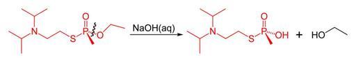 Keywords: VX-solvolysis-P-O-2D-skeletal.png Reaction scheme using skeletal formulae for the solvolysis of VX at its P-O bond with aqueous sodium hydroxide own 2007-09-08 Ben Mills Benjah-bmm27 Images by Ben Mills VX nerve agent