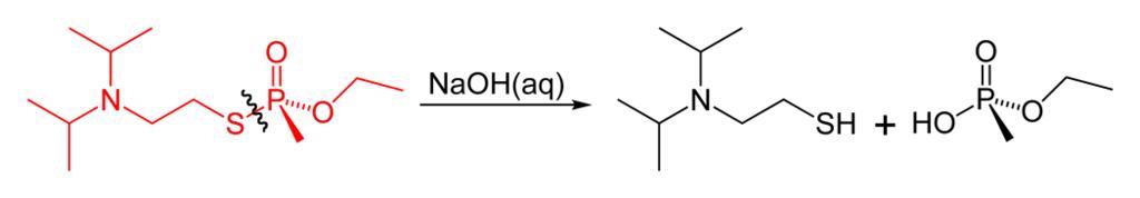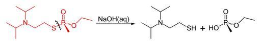Keywords: VX-solvolysis-P-S-2D-skeletal.png Reaction scheme using skeletal formulae for the solvolysis of VX at its P-S bond with aqueous sodium hydroxide own 2007-09-08 Ben Mills Benjah-bmm27 Images by Ben Mills VX nerve agent
