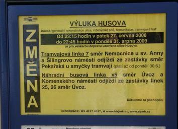 | Keywords: Vyluka (Brno).JPG cs Výluka Husova v Brně Tramvajová linka 7 nahrazena autobusovou linkou x5 Own Lukáš Malý 2008-07-29 uvolňuji dílo Public transport information in the Czech Republic Tram substitute bus transport in Brno Tram stops in Brno City transport information |