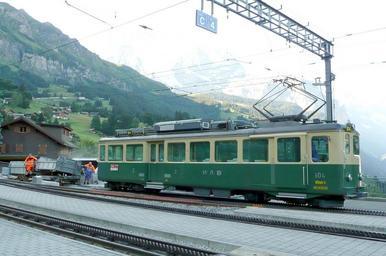 | Keywords: WAB Guetertriebwagen 104 Wengen.jpg en Wengernalp rack railway Motor coach BDhe 4/4 104 of 1951 used as cargo mover with new traction arrangement 2005 from Vossloh-Kiepe GmbH Duesseldorf With double dump wagon Fk-u 807 in Wengen station “ 2009-08-05 de Wengernalpbahn Zahnradbahn Als Guetertriebwagen umgebauter BDhe 4/4 104 von 1951 seit 2005 mit neuer AntriebsausrĂĽstung Vossloh-Kiepe Mit Doppelkippwagen Fk-u 807 im Bahnhof Wengen “ 05 08 2009 own Rahimsa Images 2009-08-05 WAB BDhe 4/4 Bt Vossloh Kiepe Wengen railway station |