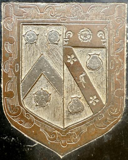 Keywords: WadhamImpalingPetre IlminsterChurch Somerset.JPG en Monumental brass escutcheon on monument to Nicholas Wadham d 1609 and his wife Dorothy Petre d 1618 Wadham Chapel Ilminster Church Somerset Arms Gules a chevron between three roses argent Wadham impaling Gules on a bend or between two escallops argent a chough proper between two cinquefoils azure in chief a rose between two demi-fleurs-de-lys Petre own photo Lobsterthermidor <span class signature-talk ></span> 17 49 18 September 2014 UTC 2014 Ilminster Wadham arms Petre arms Heraldic memorials in the United Kingdom Reliefs of coats of arms in England Strapwork |