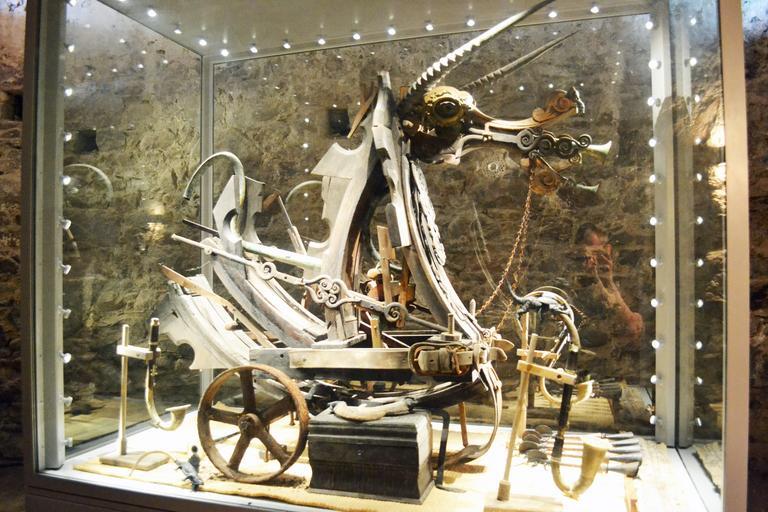 Keywords: wagon head and horns wagon glass case arts sculpture exhibit metal wood medieval mont orgueil castle gorey castle jersey channel islands