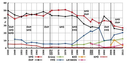 | Keywords: Wahlergebnisse aut.svg de Wahlergebnisse Östereich 2014-09-07 12 51 12 own StefanPohl v reset set term svg size 800 400 fname 'Verdana bold' fsize 13 lw 3 set key below center set border 3 set tics nomirror scale 5 set xtics rotate by 90 right set grid back lt 1 lw 5 lc rgb 0xAAAAAA set forii 2 8 style line ii pt 2 ii+1 ps 75 set style line 2 lc rgb 0xCE000C set style line 3 lc rgb 0x000000 set style line 4 lc rgb 0x6BA325 set style line 5 lc rgb 0x0E428E set style line 6 lc rgb 0xEE7F00 set style line 7 lc rgb 0xE6408D set style line 8 lc rgb 0xD40000 set ylabel ' ' offset graph 05 075 yh 28 set label ÖVP\nSPÖ\nKPÖ at 1945 5 yh set label ÖVP\nSPÖ at 1956 0 yh set label ÖVP at 1966 5 yh set label SPÖ at 1975 5 yh set label SPÖ\nFPÖ at 1983 1 yh set label SPÖ\nÖVP at 1990 1 49 set label ÖVP\nFPÖ at 2002 1 yh set label SPÖ\nÖVP at 2008 5 38 set arrow nohead from 1949 0 to 1949 graph 1 lw 5 set arrow nohead from 1966 0 to 1966 graph 1 lw 5 set arrow nohead from 1970 0 to 1970 graph 1 lw 5 set arrow nohead from 1983 0 to 1983 graph 1 lw 5 set arrow nohead from 1986 0 to 1986 graph 1 lw 5 set arrow nohead from 1999 0 to 1999 graph 1 lw 5 set arrow nohead from 2006 0 to 2006 graph 1 lw 5 set output 'wahl_aut svg' plot forii 2 8 'wahl_aut txt' u 1 ii xticlabel 1 t columnhead ii w lp ls ii unset output cc-zero Uploaded with UploadWizard Austrian general elections |