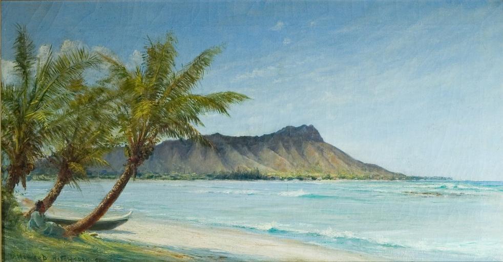| Keywords: 'Waikiki Beach in Sunlight' by D. Howard Hitchcock, 1896.JPG Waikiki Beach in Sunlight by D Howard Hitchcock 1896 oil on canvas 16 x 30 inches Frazier Fine Art 1896 D Howard Hitchcock PD-old-auto 1943 Hawaii in paintings by D Howard Hitchcock Diamond Head in art Hitchcock Paintings of palms Oil paintings of seascapes 1896 paintings |