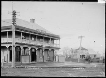 | Keywords: blackandwhite monochrome outdoor architecture building photo border black and white View of the Waipa Hotel (proprietor S. Draffin), and Jesmond Street, Ngaruawahia. Photographed by R.S.F. (probably Robert Stanley Fleming, storekeeper of the Novelty Depot). The business premises of the Novelty Depot are visible centre right, behind a horse and cart. Inscriptions: Inscribed - Photographer's title on negative -bottom left: Jesmond St. Ngaruawahia. 24.bottom right: R.S.F. Protd 1.8.10. Quantity: 1 b&w original negative(s). Physical Description: Dry plate glass negative 4.5 x 6.5 inches Fleming, Robert Stanley, fl 1910-1915. Waipa Hotel and Jesmond Street, Ngaruawahia, 1910 - Photograph taken by Robert Stanley Fleming. Price, William Archer, 1866-1948 :Collection of post card negatives. Ref: 1/2-001603-G. Alexander Turnbull Library, Wellington, New Zealand. natlib.govt.nz/records/22308698 View of the Waipa Hotel (proprietor S. Draffin), and Jesmond Street, Ngaruawahia. Photographed by R.S.F. (probably Robert Stanley Fleming, storekeeper of the Novelty Depot). The business premises of the Novelty Depot are visible centre right, behind a horse and cart. Inscriptions: Inscribed - Photographer's title on negative -bottom left: Jesmond St. Ngaruawahia. 24.bottom right: R.S.F. Protd 1.8.10. Quantity: 1 b&w original negative(s). Physical Description: Dry plate glass negative 4.5 x 6.5 inches Fleming, Robert Stanley, fl 1910-1915. Waipa Hotel and Jesmond Street, Ngaruawahia, 1910 - Photograph taken by Robert Stanley Fleming. Price, William Archer, 1866-1948 :Collection of post card negatives. Ref: 1/2-001603-G. Alexander Turnbull Library, Wellington, New Zealand. natlib.govt.nz/records/22308698 |