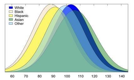 | Keywords: WAIS-IV FSIQ Scores by Race and Ethnicity.png en Approximate Wechsler Adult Intelligence Scale IV full-scale IQ score distributions for US racial and ethnic groups The data are based on samples matched to the US Census for education and region of the country within racial/ethnic group Group mean score standard deviation sample size White 103 21 13 77 1540<br> Black 88 67 13 68 260<br> Hispanic 91 63 14 29 289<br> Asian 106 07 15 01 71 <br> Other 98 93 13 99 40 Consists of Native American Indians Alaskan Natives and Pacific Islanders WAIS-IV Clinical Use and Interpretation by Weiss LG et al 2010 Table 4 3 p 118 Victor Chmara 2011-02-06 n set terminal pngcairo enhanced font arial 15 size 1000 600 set output WAIS-IV FSIQ Scores by Race and Ethnicity png set style fill transparent solid 0 5 border -1 set key inside left top vertical Left reverse enhanced autotitles nobox set key noinvert samplen 1 spacing 1 width 0 height 0 set style function filledcurves y1 0 set xrange 55 145 noreverse nowriteback unset ytics Gauss x mu sigma 1 / sigma sqrt 2 pi exp - x-mu 2 / 2 sigma 2 d1 x Gauss x 103 21 13 77 white d2 x Gauss x 88 67 13 68 black d3 x Gauss x 91 63 14 29 Hispanic d4 x Gauss x 106 07 15 01 Asian d5 x Gauss x 98 93 13 99 Other plot d1 x fs solid 1 0 lc rgb blue title White \ d2 x lc rgb F5DEB3 title Black \ d3 x lc rgb yellow title Hispanic \ d4 x lc rgb 228B22 title Asian \ d5 x lc rgb 87CEFA title Other set output Cc-zero IQ Race in the United States Demographic charts of the United States |