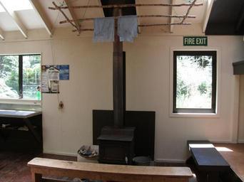 Keywords: Waitewaewae Hut 7.jpg Interior of the Waitewaewae hut Potbelly stove Fire exit see F Waitewaewae Hut 4 jpg 2013-02-21 own Sarang Waitewaewae Hut Hiking shelter stoves