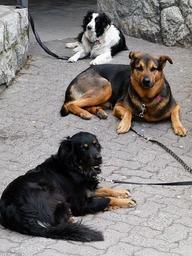 Keywords: waiting lying dogs canine pet animals leashed puppies