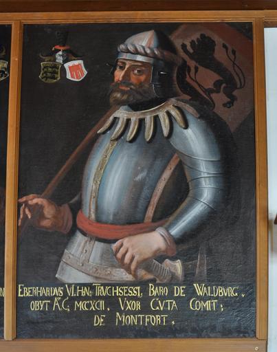 | Keywords: Waldburg Rittersaal Portrait 08.jpg Burg Waldburg Württemberg Porträtgalerie im Rittersaal Gemälde von Franz Joseph Müller um 1780; Porträt laut Inschrift Eberhard VI starb 1292 Ehefrau Guta von Montfort; gemeint wohl Eberhard II v Waldburg ca 1260-1291 oo Elisabeth von Montfort own own photograph 2013-05-05 Paintings Franz Joseph Müller; Photo Andreas Praefcke File Truchsessenchronik Cod Don 590 134 jpg Photos by User AndreasPraefcke Paintings in the Waldburg Rittersaal Waldburg Eberhard II von Waldburg Franz Joseph Müller painter Coats of arms of Montfort |