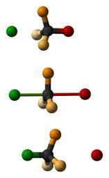 | Keywords: Walden-inversion-3D-balls.png Montage using ball-and-stick models of the three steps in an S<sub>N</sub>2 reaction Colour is used to emphasise the inversion of stereochemical configuration Walden inversion that occurs at the central atom The green atom is the nucleophile the red atom is the leaving group and the three orange atoms are substituents Own 2007-12-01 Ben Mills Benjah-bmm27 Images by Ben Mills Walden inversion | ||||