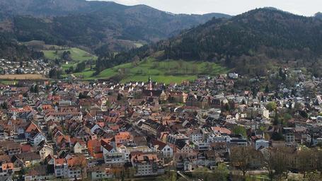 Keywords: waldkirch village black forest bird's eye view rooftops mountains