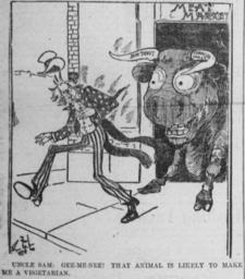 | Keywords: Walker cartoon about beef prices and vegetarianism.jpg Uncle Sam is chased out of a market by a bull whose horns are marked Trust business BEEF TRUST and ADVANCED PRICES he comments that the animal will likely make him become a vegetarian 1904-04-06 http //chroniclingamerica loc gov/lccn/sn88085187/1904-04-06/ed-1/seq-4/ the Tacoma Times Ryan Walker 1870 - June 23 1932 other versions PD-old-70-1923 Uploaded with UploadWizard 1900s political cartoons of the United States Images from The Tacoma Times Cartoons by Ryan Walker 1904 cartoons Uncle Sam |