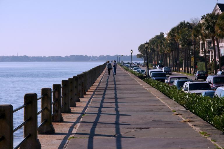 Keywords: walking women walkway sidewalk bay water haze charleston south carolina tree state america usa summer spring