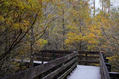 Keywords: walkway autumn path nature trail wood fall leaves cypress trees florida outdoor scenic plant park preserve